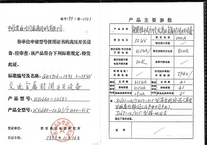 KYN40-12(Z)型号使用证书