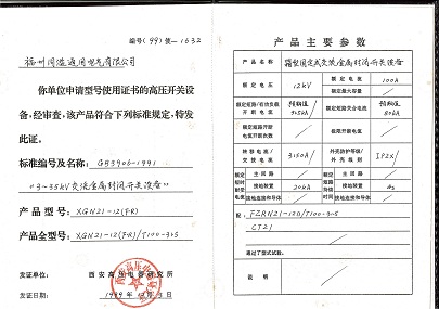 XGN21-12(FR)型号使用证书